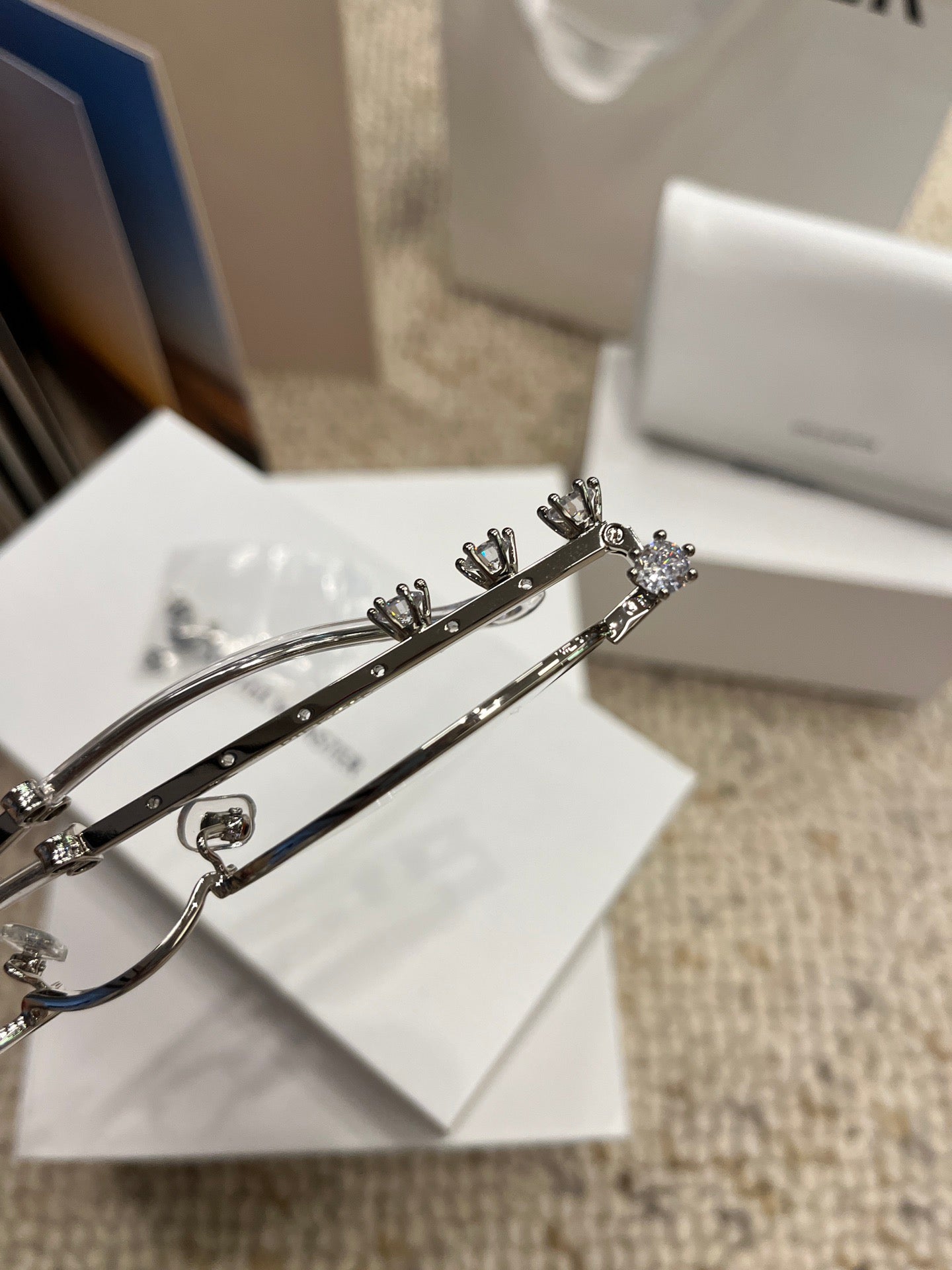 Crafted in glossy silver metal, the lightweight oval frame features signature “pierced” embellishments on the temples, adding a touch of rebellious edge to the refined silhouette. The clear lenses offer versatile styling options and 99.9% UV protection, making them perfect for both fashion-forward looks and everyday wear.